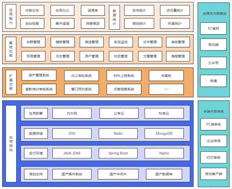系统支持扩展多渠道信息发布管理系统,实现门户网站PC端、移动端、微信公众号、微博等多渠道的内容统一发布和管理。