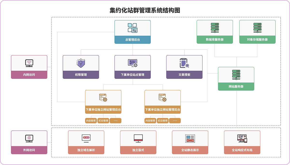 系统既适用于独立的门户网站建设,又支持多级别、横向或纵向的网站群建设,各站点都可以设置独立域名进行访问。系统支持对各个子站进行集约化管理,形成数据大集中,有利于资源的整合、共享和管理。系统又可为每个站点指定不同的用户管理、维护和发布内容,满足网站群多级管理的需要。