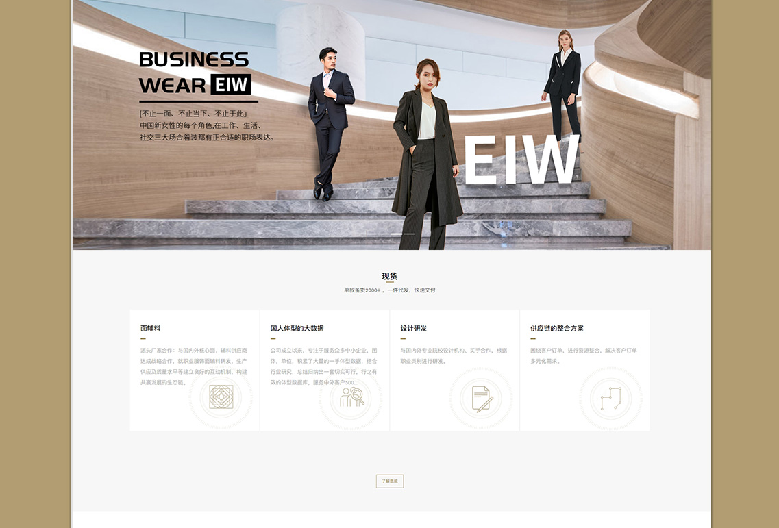 意威服饰于2014年3月25号成立,多年来,坚持服务同行,服务品牌商,渠道商,已成为国内知名的现货职业装一站式供应链平台。