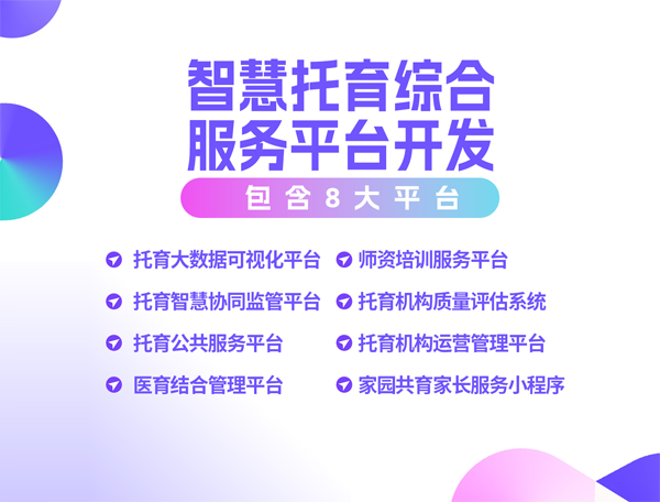 智慧托育服务平台涵盖了大数据可视化平台、托育智慧协同监管平台、托育公共服务平台、托育机构备案信息系统、托育机构运营管理系统、家园共育平台(老师端、家长端)、智慧物联&智能硬件对接和系统综合基础服务模块等功能系统。通过这个综合性服务平台,不仅可以实现托育服务的数字化和信息化管理,还能够满足家长对托育机构的公示信息查询和科学育儿知识的学习等需求,也为托育机构的运营管理、家园共育和备案工作提供便利。