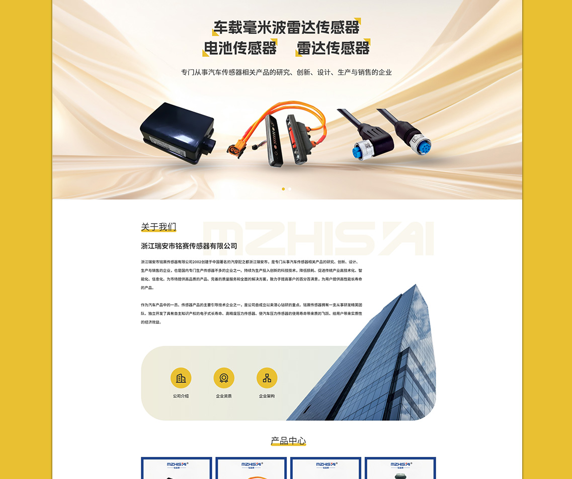 浙江瑞安市铭赛传感器有限公司在2002年创建于中国著名的汽摩配之都浙江瑞安市,是专门从事汽车传感器相关产品的研究、创新、设计、生产与销售的企业,也是国内专门生产传感器不多的企业之一。持续为生产投入创新的科技技术,降低损耗、促进传统产业高技术化、智能化、信息化,也为了适应汽车市场新能源领域逐渐增高的市场份额,其研究并且投入生产使用的产品有雷达传感器、电池传感器等,为市场提供高品质的产品、完善的质量服务和全面的解决方案,致力于提高客户的百分百满意,为用户提供高性能长寿命的产品。